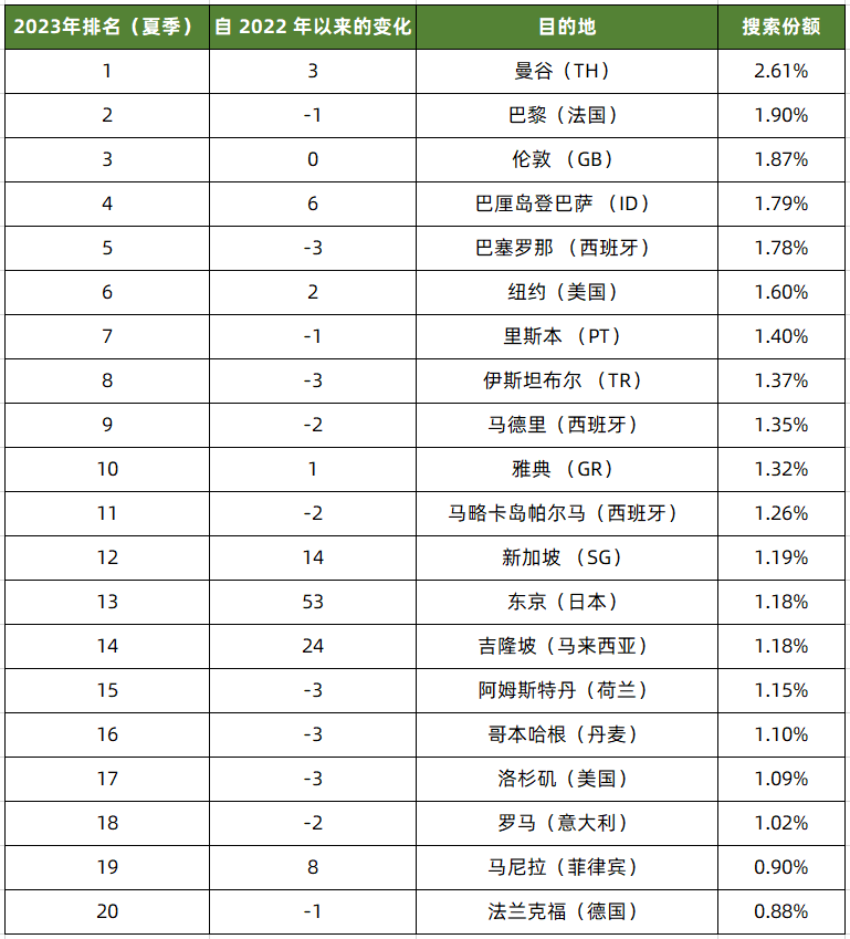 全球旅游分析公司ForwardKeys公布了2023年夏季热门旅行目的地排名,排名数据依据搜索引擎以及旅行社、信息聚合商等为参考。东京以53位跃升至第13位,中国香港跃升129位,排在第39位。